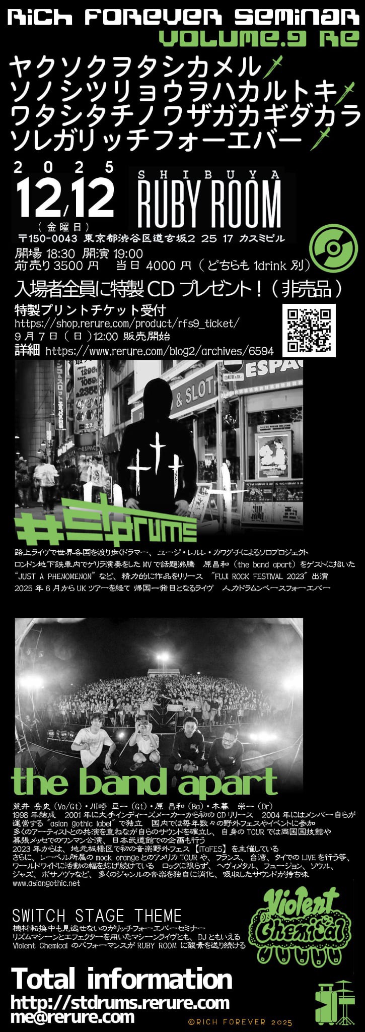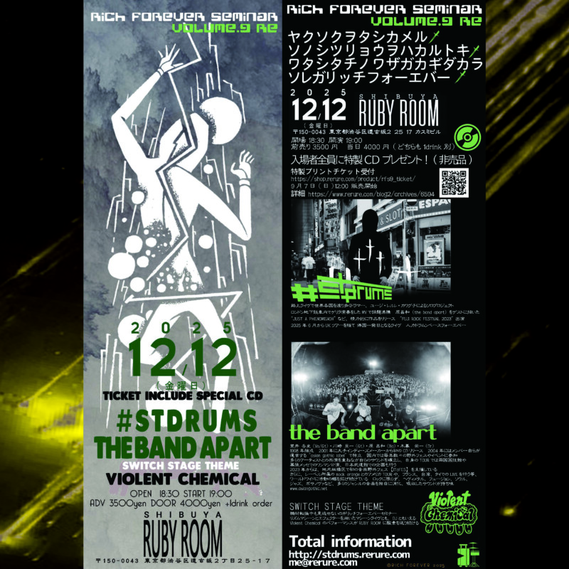 5年の歳月を経て…いよいよ開催決定!the band apart#STDRUMS のツーマンライヴ【RICH FOREVER SEMINAR vol.9re】渋谷RUBY ROOM という密接な距離感で、空気の振動を全身で味わえる絶好のチャンス。機材転換中 〜 SWITCH STAGE THEME 〜 では Violent Chemical のパフォーマンスがRUBY ROOM に酸素を送り続ける。2020年、中止を余儀なくされた vol.9 の振替公演が遂に実現!